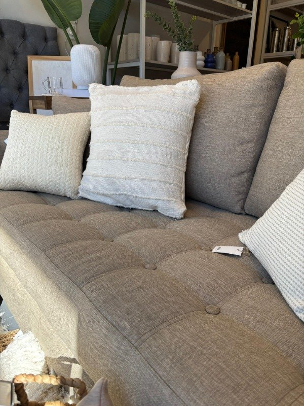 Tapizado con género rústico ("Spazio" tono lino) anti mancha y anti desgarro. Los almohadones contienen cierres y son 100% lavables.